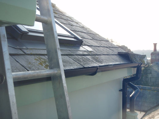 Tall Roofer Josh came back by four fifteen with an older, even taller man. I introduced myself as John and asked his name. "I'm his Dad". Up on the roof, Josh discovered several more faults: all of the ridge tiles above Caroline's bedroom were loose; there were two slates missing; and one of the the lead valleys had a hole in it. Josh stuck the ridge tile on — like a temporary filling at the dentist — and will come back on Tuesday to do a proper job.
